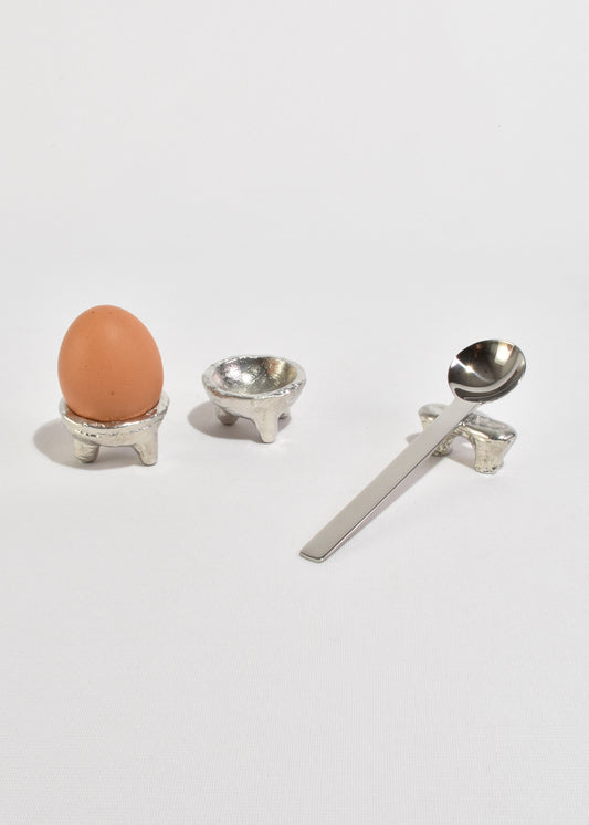 A handcrafted tin set for the ideal breakfast: a soft-boiled egg, a pinch of salt, and an open book.