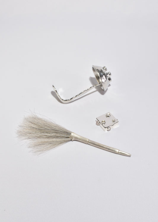This set considers the luxury of restraint, with a museum-like pill box for life's tiny necessities and small secrets; a vase that forces you to choose a single bloom, and a horsehair pen that turns writing into a deliberate act.