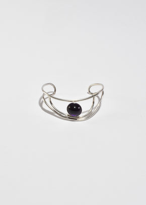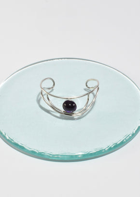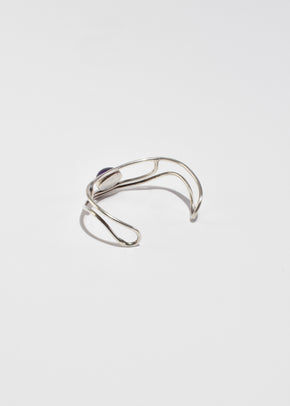 Continue shoppingVintage, handmade sterling bracelet in an organic shape with an oval amethyst cabochon. Signed by the artist, Ry Sterling.