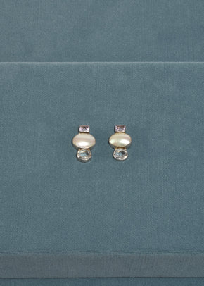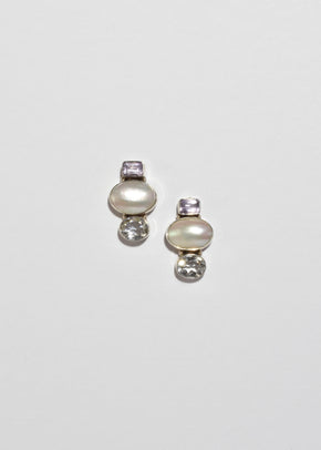 Continue shoppingBeautiful, vintage sterling earrings with oval mother of pearl cabochons and faceted quartz and amethyst stones, pierced. Stamped, 925.