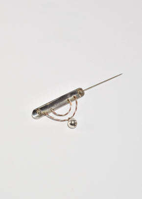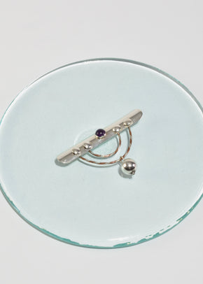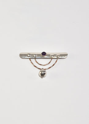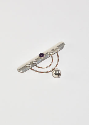 Continue shoppingRare, handmade vintage brooch in sterling and copper with stripe detail and a round amethyst cabochon, pin-back closure.