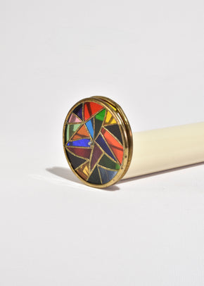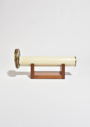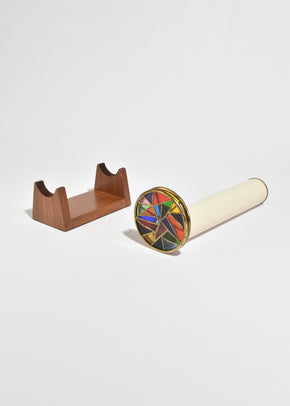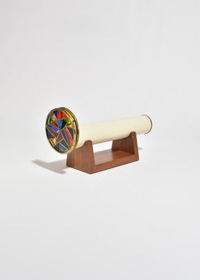 Continue shoppingVintage kaleidoscope with a cream enamel body, brass fittings, and a stained glass wheel in vivid jewel tones. Resting on a sculpted walnut base.