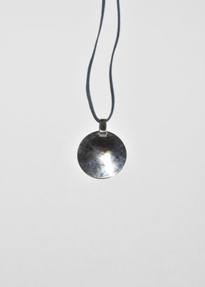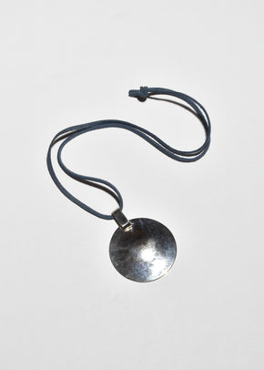 Continue shoppingVintage sterling sculptural disc pendant set on a suede cord with tie closure. Stamped, One World.