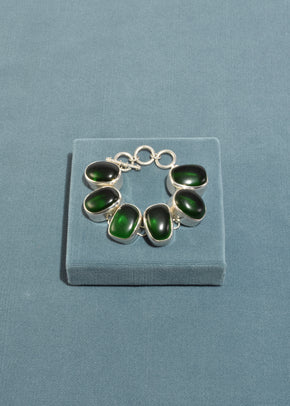 Continue shoppingRare, vintage sterling statement bracelet with large, organic shaped green glass cabochons and adjustable hook and eye closure. Stamped, Charles Albert Sterling Silver 925.
