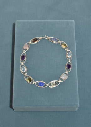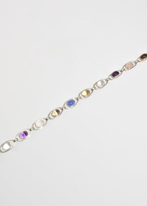 Continue shoppingRare, vintage sterling necklace with oval links and colorful multi stone oval cabochons, clasp closure.