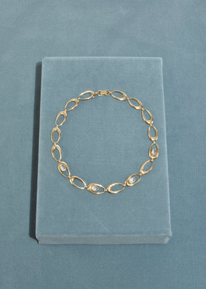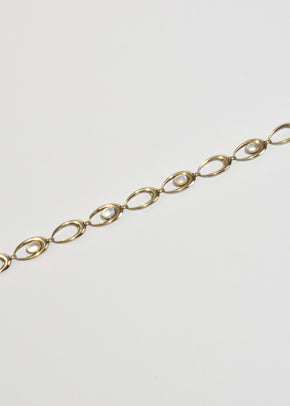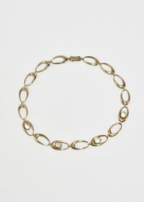 Continue shoppingRare, vintage 14k gold plated necklace with oval links and four oval moonstone cabochons and fold over clasp closure. Stamped, 14k, Sterling, SYMMETALIC.