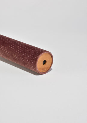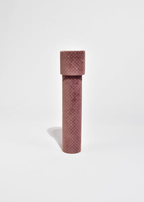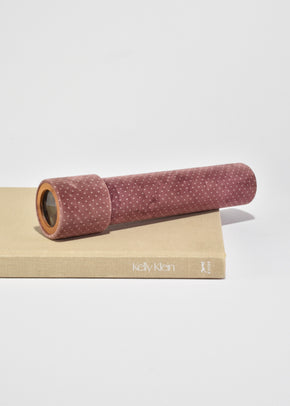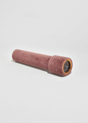 Continue shoppingHandmade wooden kaleidoscope with cylindrical body wrapped in plum velvet with a subtle dotted pattern. The ends are left exposed to reveal the wood, one fitted with a viewing lens and the other containing loose multicolored glass pieces to create shifting, prismatic imagery. Signed C. Huber on the base.
