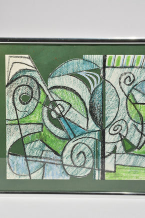 Continue shoppingFramed crayon and oil pastel collage on paper. The composition combines bold black linework with areas of green, blue and white, forming interlocking spirals and geometric shapes in a cubist-inspired rhythm.