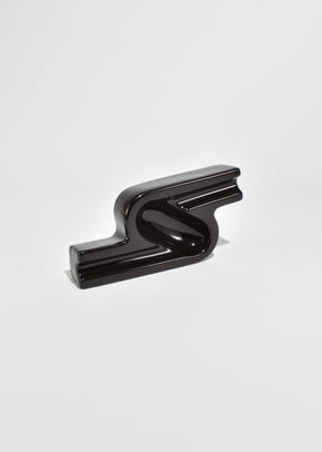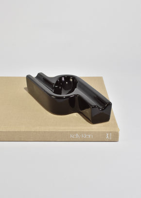 Continue shoppingGlossy black ceramic ashtray or catchall with a sculptural, geometric form. The design features bold linear channels and a recessed bowl, giving it a sleek, architectural presence.