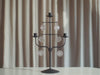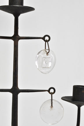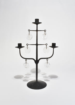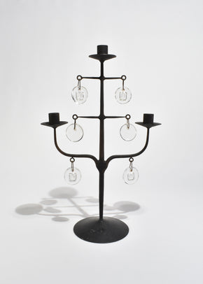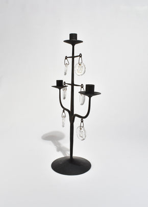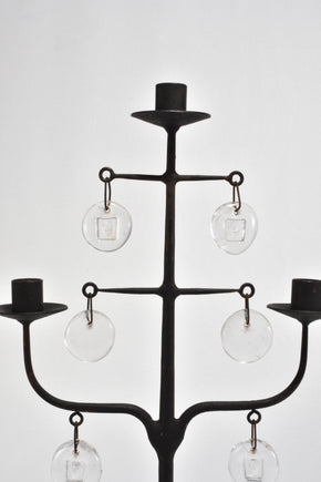 Continue shoppingMid-century wrought iron candelabra with three candle holders and suspended clear glass drops. Designed by Erik Höglund for Boda, Sweden. Sculptural form with circular base and symmetrical arms.