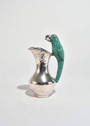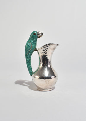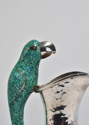 Continue shoppingA mid-century pitcher in silver-plated hammered copper, distinguished by its parrot handle wrapped in crushed-stone inlay. A sculptural, characterful piece of Mexican craftsmanship. Unmarked, attributed to Los Castillo.