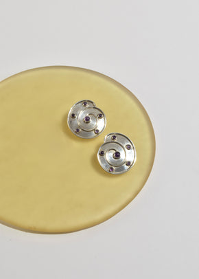 Continue shoppingRare, handmade vintage sterling earrings in a spiral design with round amethyst cabochons, pierced. Signed by artist, Sterling Clyne.