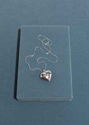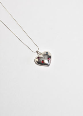 Continue shoppingBeautiful, vintage sterling necklace with an oversized heart shaped pendant studded with colorful glass cabochons, clasp closure.