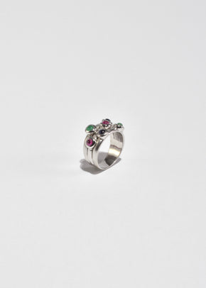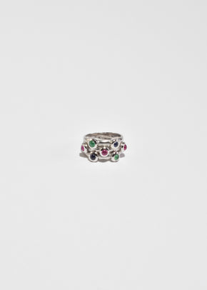 Continue shoppingRare, vintage multi band white gold ring with colorful multi-stone cabochons. Stamped, 14k.