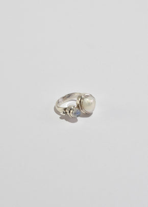 Continue shoppingRare, vintage sterling ring with an organic shaped pearl and a round moonstone cabochon. Stamped, 925.