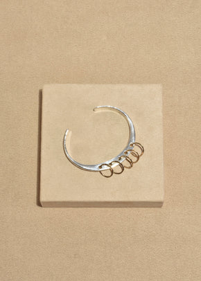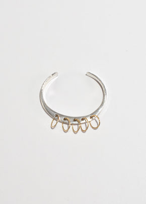 Continue shoppingRare, handmade sterling cuff bracelet with five gold pierced hoops and hammered detail. Stamped, 14k GF PJ.