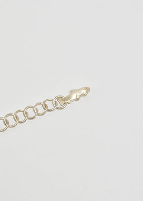 Continue shoppingA sterling casted trout on a hand fabricated curb chain, with twinkling yellow sapphire eyes, clasp closure. Handmade in the studio of Lizzie Ames in Brooklyn, NY.