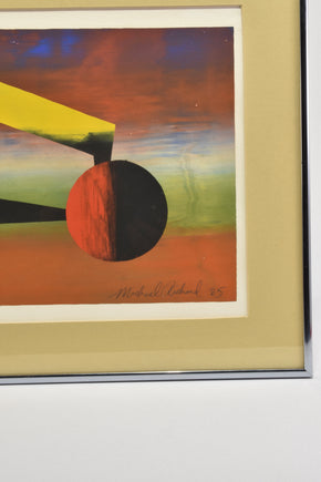 Continue shoppingVintage geometric screenprint rendered in high-contrast color. A vivid red and black circle intersects with a sharp yellow angular form, set against a layered backdrop of softly blended horizon-like bands. Titled Altered Space in the lower left and signed Michael Richard '85 in the lower right.