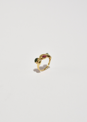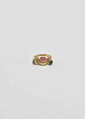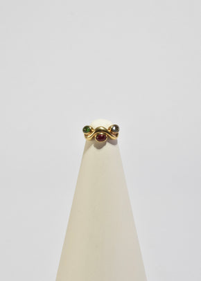 Continue shoppingRare, vintage gold ring in a wavy design with three tourmaline cabochons. Stamped, KM 585 14k gold.