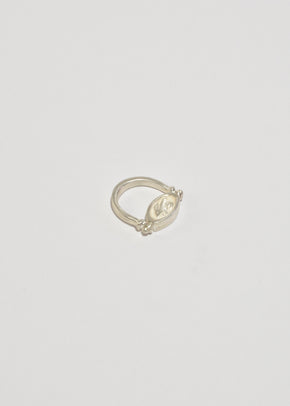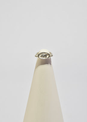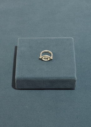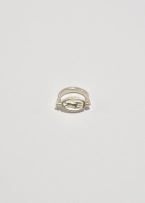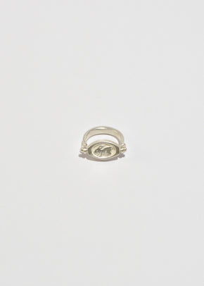 Continue shoppingCast sterling pivoting ring that depicts a continuous chase that ensues between a hound and a rabbit, running in circles. Handmade in the studio of Lizzie Ames in Brooklyn, NY.