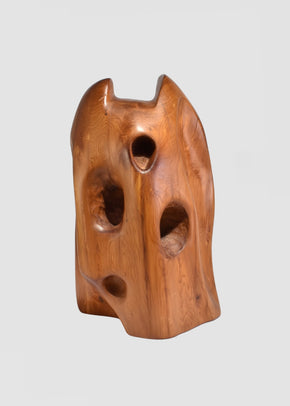 Continue shoppingLarge, hand-carved teak sculpture with an organic, architectural form. Smoothly polished surface reveals rich grain variation, knots, and natural voids that give the piece a sculptural rhythm. Vertical in stance with softly contoured edges, balancing weight and negative space. Suitable as a standalone object or pedestal-style accent.