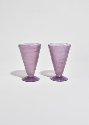 Continue shoppingHandblown stemmed glasses in translucent lavender with spiral texture and scattered air bubbles. Each varies slightly in shape and tone.