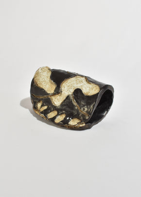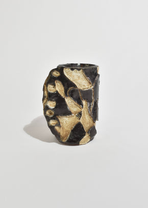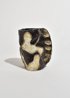 Continue shoppingHand-built stoneware vessel with an abstract carved relief pattern in deep espresso and sand tones. Organic, asymmetric form with a raw, textured surface and glossy glazed inlays. Signed on the base.