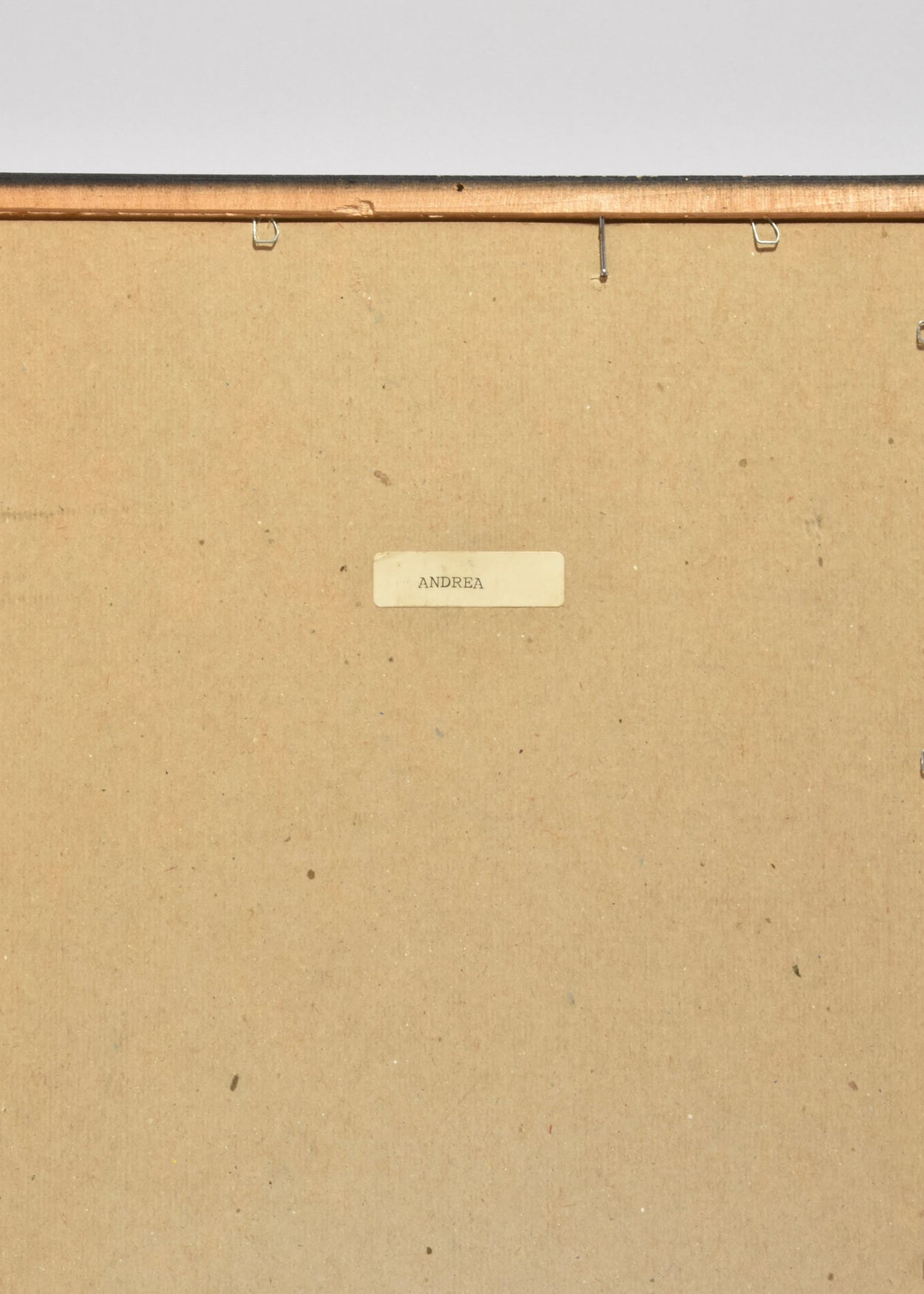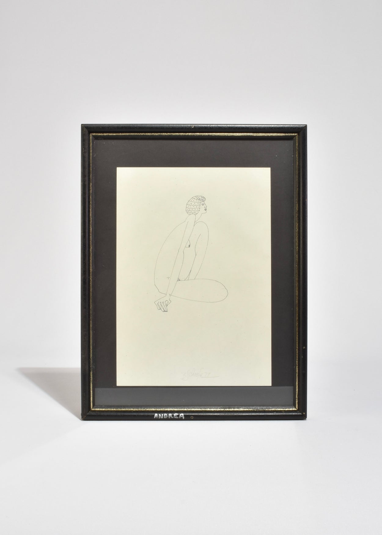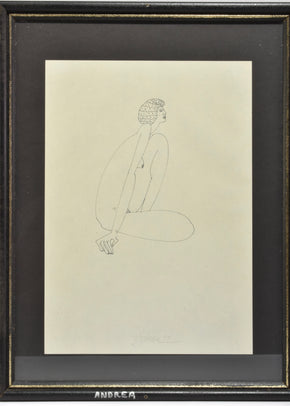 Continue shoppingMinimalist ink drawing titled Andrea, signed B. Schaefer and dated 1978. A poised, nude figure is rendered in fine, continuous line with a stylized, textured hair pattern and elongated proportions. The composition balances restraint and sensuality, with delicate attention to gesture and anatomy.