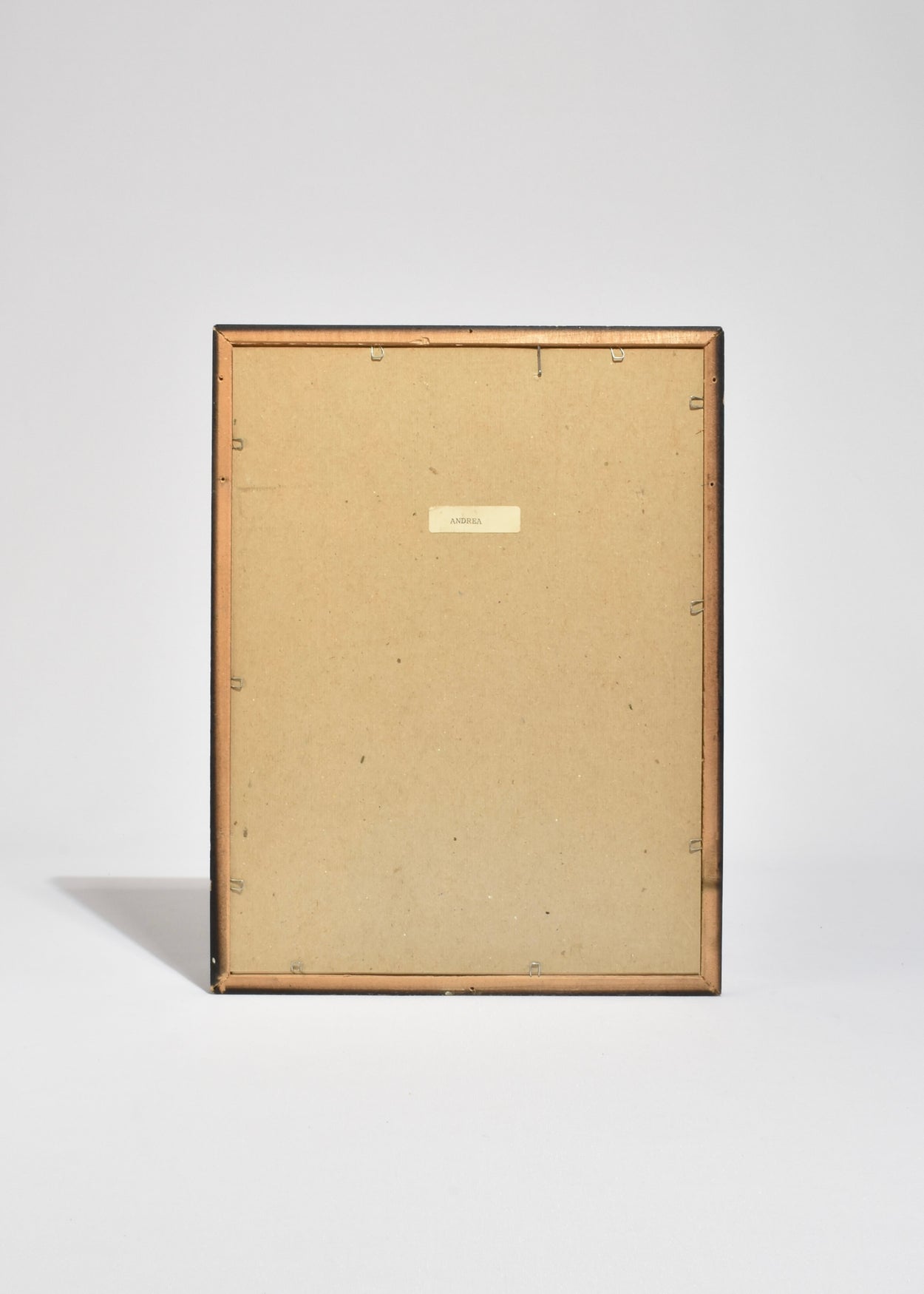 Framed under glass in a black painted wood frame with gold detail and original back label.