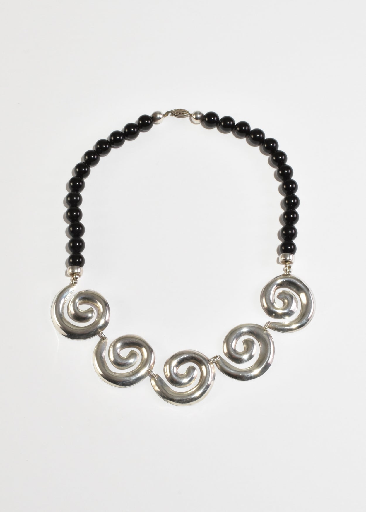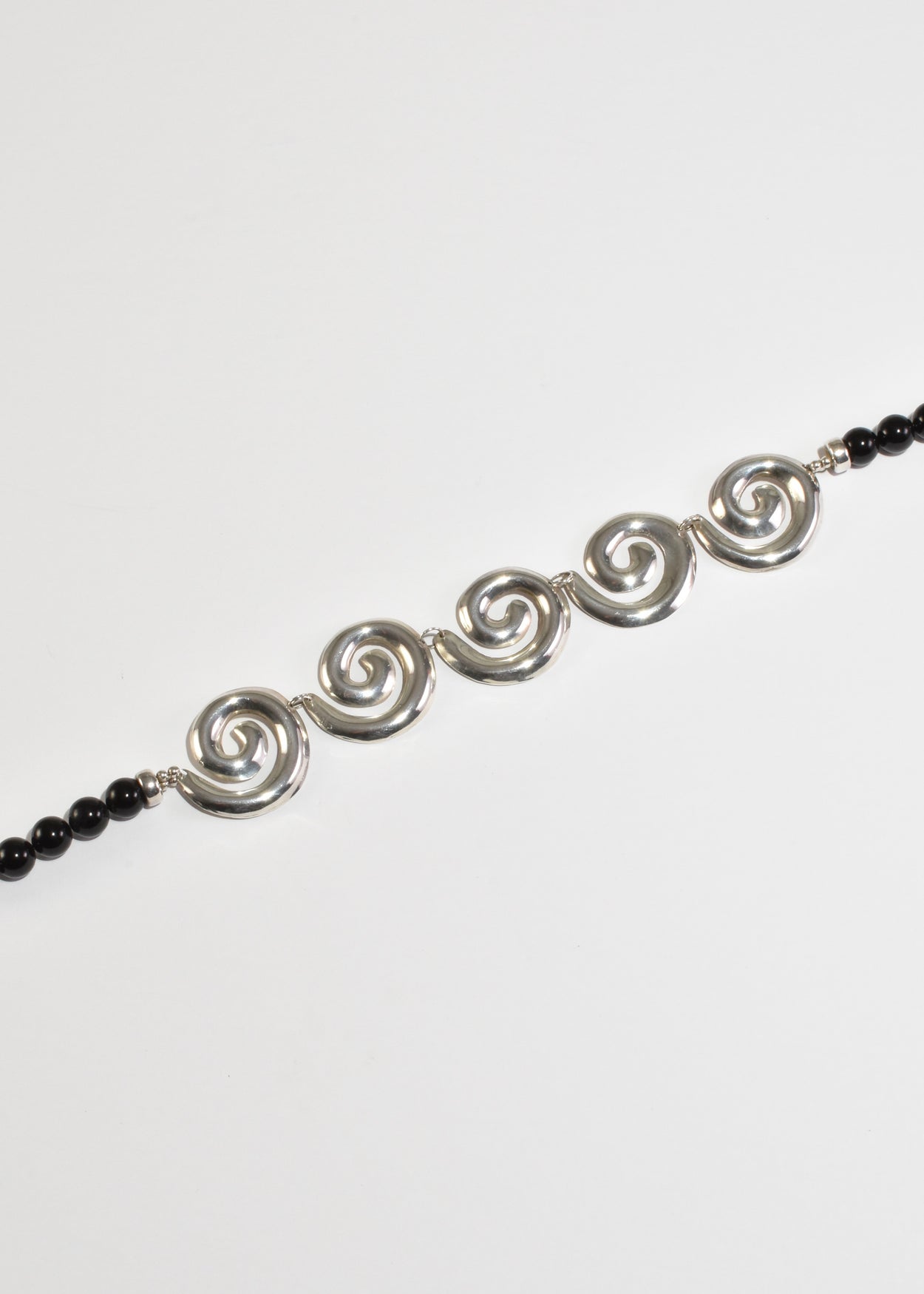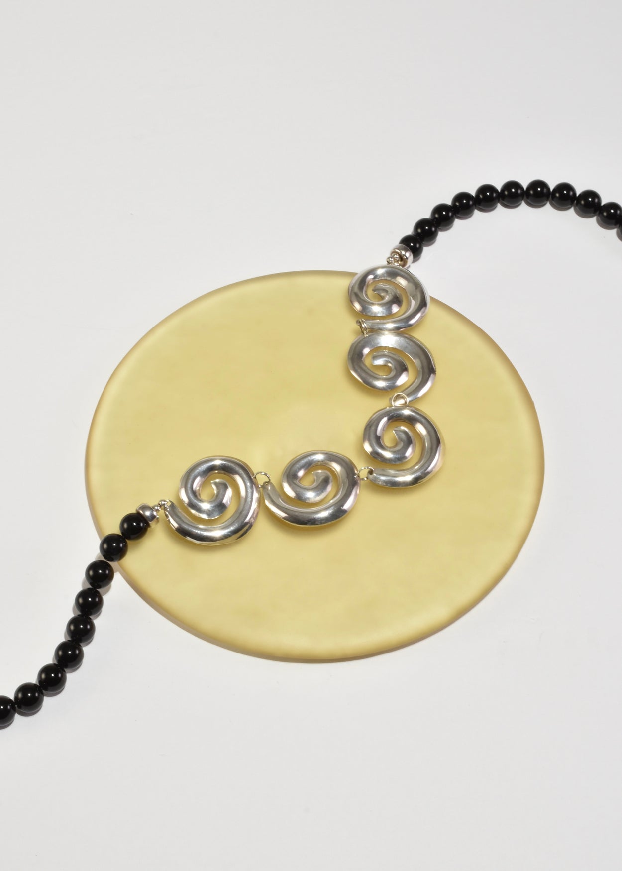 Continue shoppingVintage necklace with sterling spiral links and black round glass beads, filagree closure.