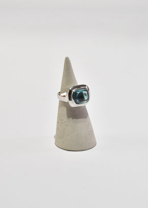 Continue shoppingVintage, Sterling ring in a modernist design with a polished rectangular blue topaz cabochon. Stamped, 925.