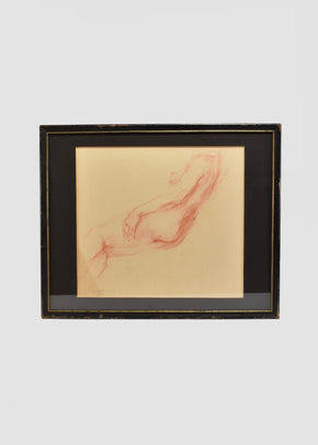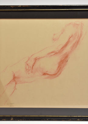 Continue shoppingA gestural nude study of a female figure in a relaxed pose in red chalk on paper. Signed in the lower left, To Marty.