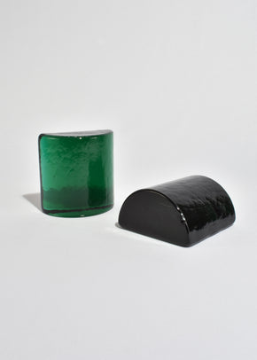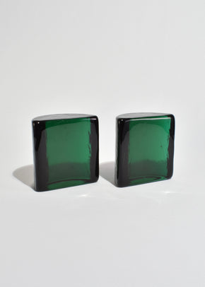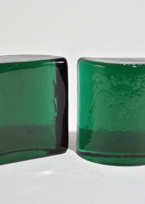 Continue shoppingSet of two vintage glass half-moon bookends in emerald by Blenko Glass Company.