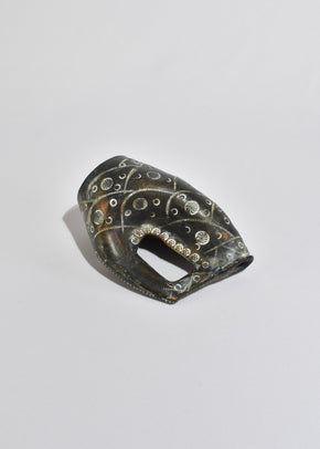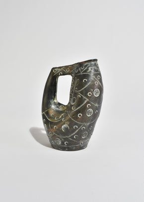 Continue shoppingHand-carved ceramic vessel with an arched, sculptural form and cutout handle. Incised with geometric motifs reminiscent of midcentury, Picasso-era ceramics. Dark brown glaze with white inlay and a beautifully worn patina. A striking, expressive accent piece.