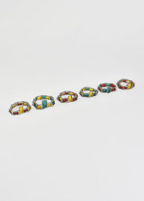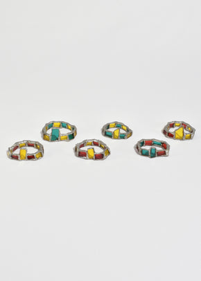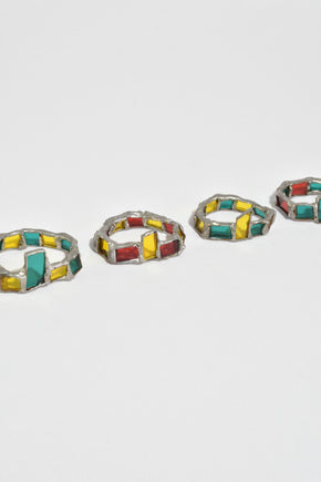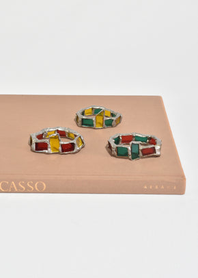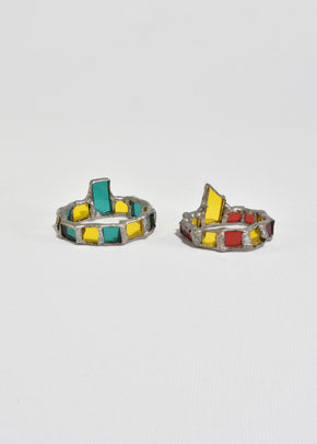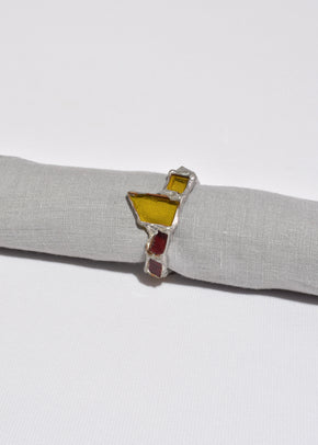 Continue shoppingSet of six handmade stained glass napkin rings in red, yellow, and teal. Each ring is crafted with irregular leaded framing and vibrant glass panels, giving them a sculptural, jewel-box feel for the table.