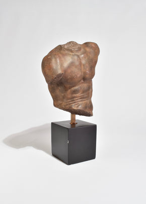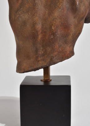 Continue shoppingCast plaster sculpture of a male torso mounted on a square black base. The surface features a warm brown finish that accentuates the musculature and classical contours. Signed Alva 1991 / S. Eylanbekov on reverse.