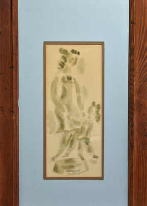 Continue shoppingA tender study of a mother and child, rendered in soft tonal washes with quick, expressive linework characteristic of Chaim Gross’ mid-century drawings. The figures feel gently animated, their forms emerging through layered strokes of gray and olive.