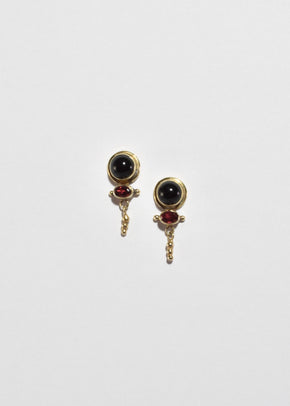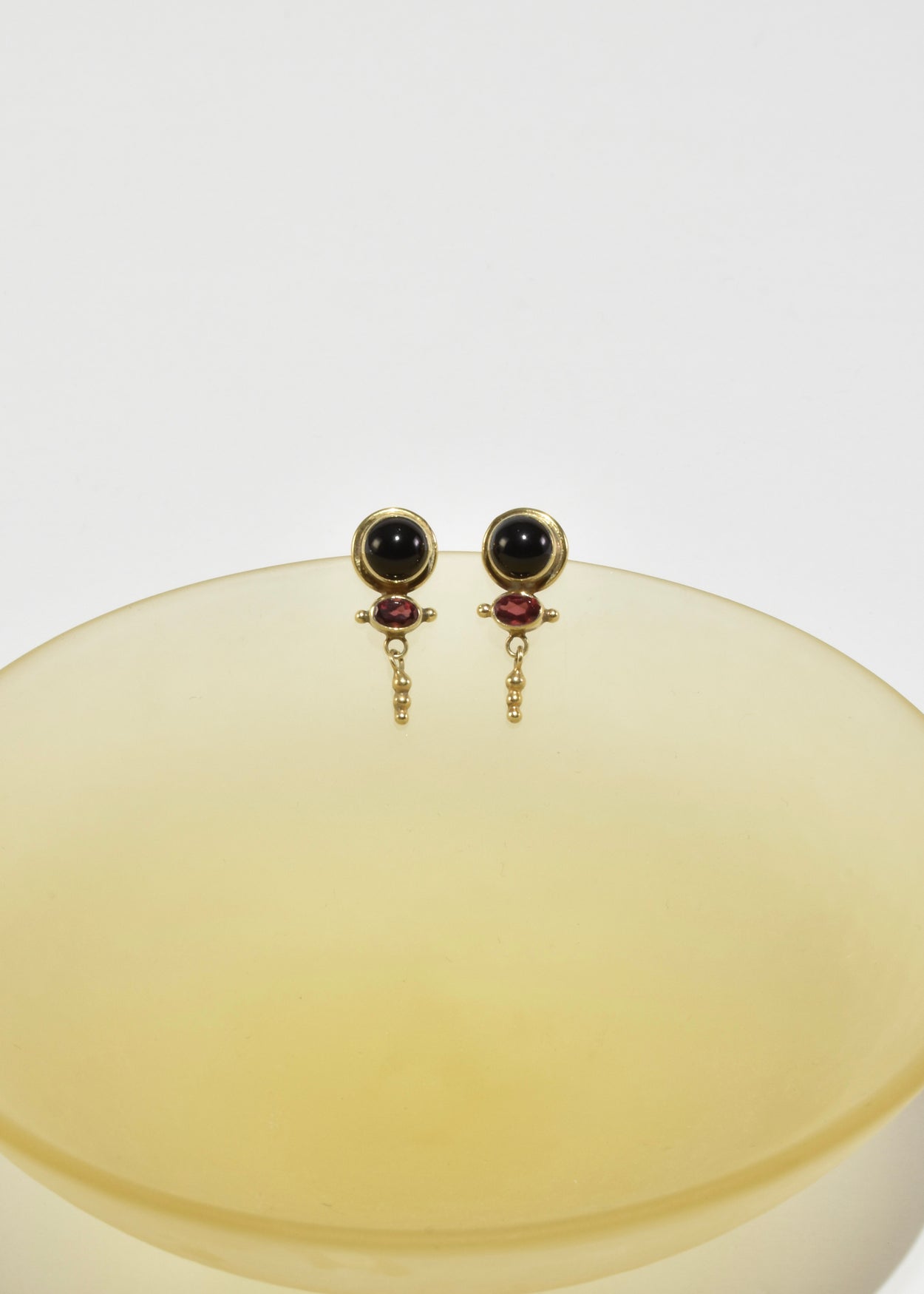 Continue shoppingRare, vintage gold earrings with round polished onyx cabochons and faceted garnet stones, pierced. Stamped, 925.