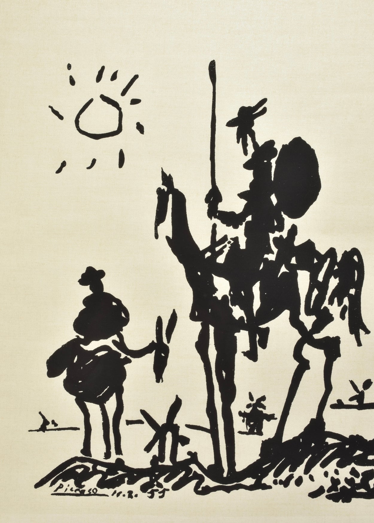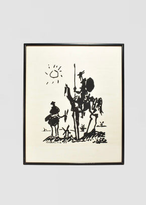 Continue shoppingVintage screenprint reproduction of Pablo Picasso’s Don Quixote, based on the original 1955 ink drawing first published in Les Lettres Françaises. The image features Don Quixote and Sancho Panza rendered in expressive black silhouette beneath a blazing sun, with windmills scattered in the distance. Printed on canvas-textured material, the composition channels the bold economy and humor of Picasso’s late work.