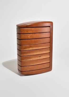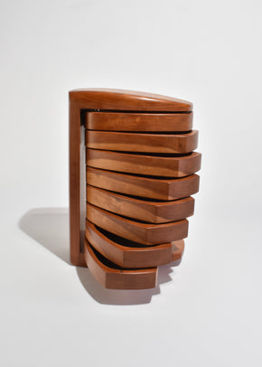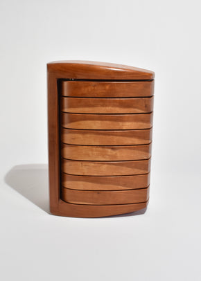 Continue shoppingLarge, handmade sculptural wooden jewelry box with eight pivoting compartments lined in grey suede. Signed on base, Kellam '98.
