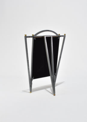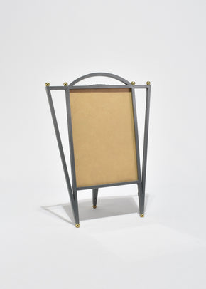 Continue shoppingA postmodern style picture frame in brushed steel with a built-in easel-style support. The front features a minimal rectangular window topped with a curved arch and small brass ball finials at each corner. Ca. 1990s.