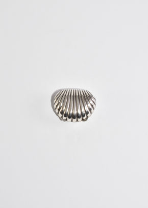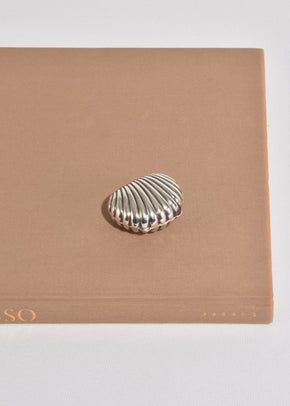 Continue shoppingA petite hinged pillbox crafted in 800 silver and shaped as a scallop shell. Both exterior and interior feature crisp radiating fluting, giving the piece a sculptural, tactile quality. Hallmarked 800 on the rim. A refined pocket object for keeping small essentials.