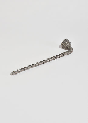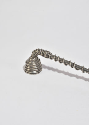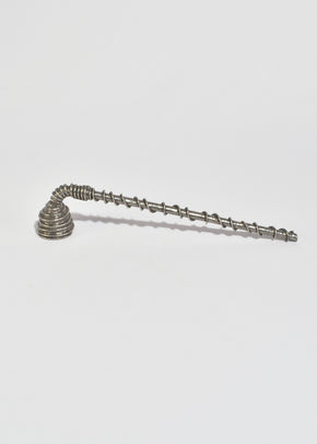 Continue shoppingA long, sculptural candle snuffer in cast pewter with a coiled, ribbed handle and a tiered bell. The elongated form gives it presence and reach, making it as functional as it is decorative. Stamped: Patrick Meyer.