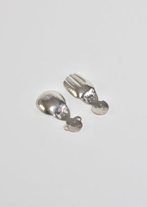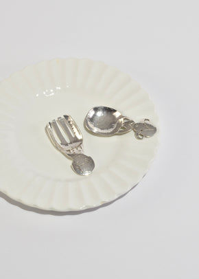 Continue shoppingA charming pair of hand-hammered sterling utensils, one fork and one spoon, each cut and etched in the shape of a stylized girl and boy. Marked Sterling on the reverse.